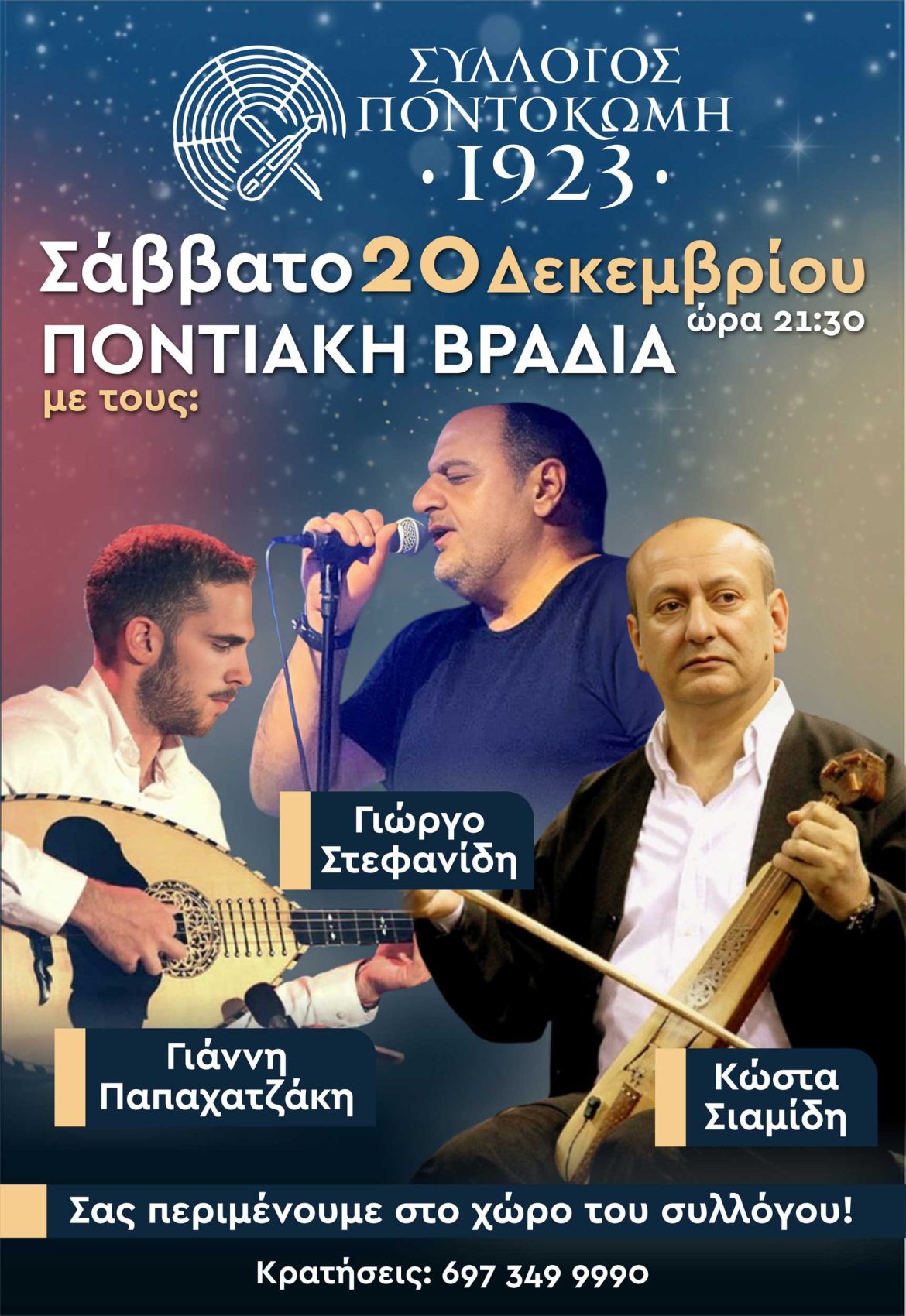 Σύλλογος «Ποντοκώμη 1923»: Σάββατο 20 Δεκεμβρίου Ποντιακή βραδιά με τον Γιώργο Στεφανίδη, τον Κώστα Σιαμίδη και τον Γιάννη Παπαχατζάκη!