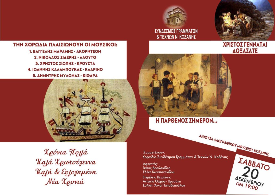 Τα μέλη της παραδοσιακής χορωδίας καθοδηγούμενα από τον χοράρχη τους κο Ευάγγελο Μυλωνά, υπό του ήχους παραδοσιακών οργάνων και την συμμετοχή άξιων συνεργατών παρουσιάζουν το Σάββατο 20 Δεκεμβρίου, στο Λαογραφικό μουσείο, κάλαντα από όλη την Ελλάδα, αναγγέλλοντας το θαυμαστό γεγονός της ενανθρωπίσεως του Κυρίου.