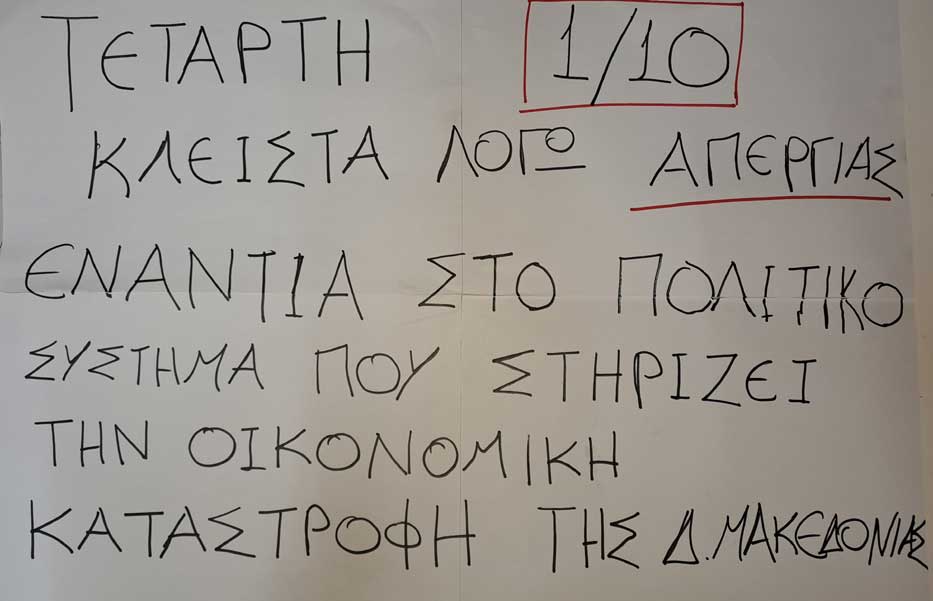 ΤΕΤΑΡΤΗ 1/10 ΚΛΕΙΣΤΑ ΛΟΓΩ ΑΠΕΡΓΙΑΣ ΕΝΑΝΤΙΑ ΣΤΟ ΠΟΛΙΤΙΚΟ ΣΥΣΤΗΜΑ ΠΟΥ ΣΤΗΡΙΖΕΙ ΤΗΝ ΟΙΚΟΝΟΜΙΚΗ ΚΑΤΑΣΤΡΟΦΗ ΤΗΣ ΔΥΤΙΚΗΣ ΜΑΚΕΔΟΝΙΑΣ