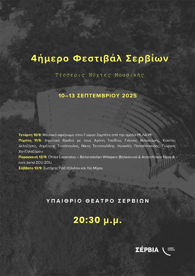 Ο Δήμος Σερβίων ανακοινώνει την πραγματοποίηση τετραήμερου μουσικού φεστιβάλ στο Θεατράκι Σερβίων, από την Τετάρτη 10 έως το Σάββατο 13 Σεπτεμβρίου 2025, με ώρα έναρξης 20:30.
