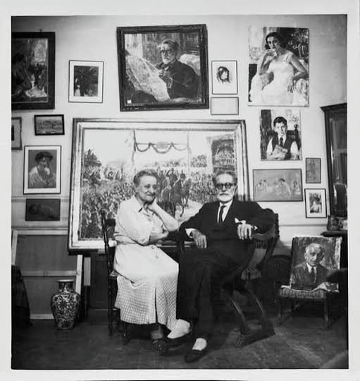 ( Η ζωγράφος σε μεγάλη ηλικία με τον σύζυγό της Νικόλαο Καραβία εκδότη της Εφημερίδας “ΚΑΪΡΟ” της Αιγύπτου. Ήταν η εφημερίδα στην οποία η Θάλεια εργάστηκε ως πολεμική ανταποκριτής του Πρώτου Βαλκανικού Πολέμου.)
