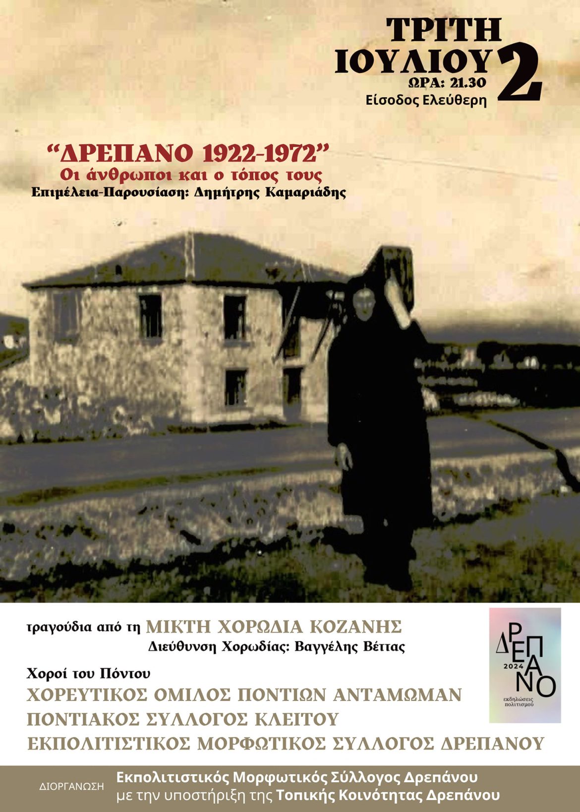 Θύμησες από το παλιό Δρέπανο θα ζωντανέψουν την Τρίτη 2 Ιουλίου 2024, στις 9.30 το βράδυ, στον αύλειο χώρο του Δημοτικού Σχολείου, με την παρουσίαση του ιστορικού λευκώματος: “ΔΡΕΠΑΝΟ 1922-1972” : Οι άνθρωποι και ο τόπος τους…