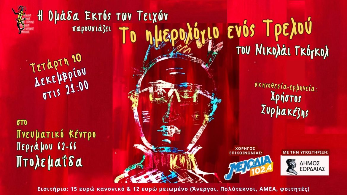Η Ομάδα Εκτός των Τειχών παρουσιάζει το μοναδικής ψυχολογικής ακριβείας έργο του Νικολάι Γκόγκολ ‘’Το ημερολόγιο ενός τρελλού’’. Το΄΄Ημερολόγιο΄΄, γραμμένο το 1835, αποτελεί ένα σχεδόν αυτοβιογραφικό κείμενο του ίδιου του συγγραφέα.