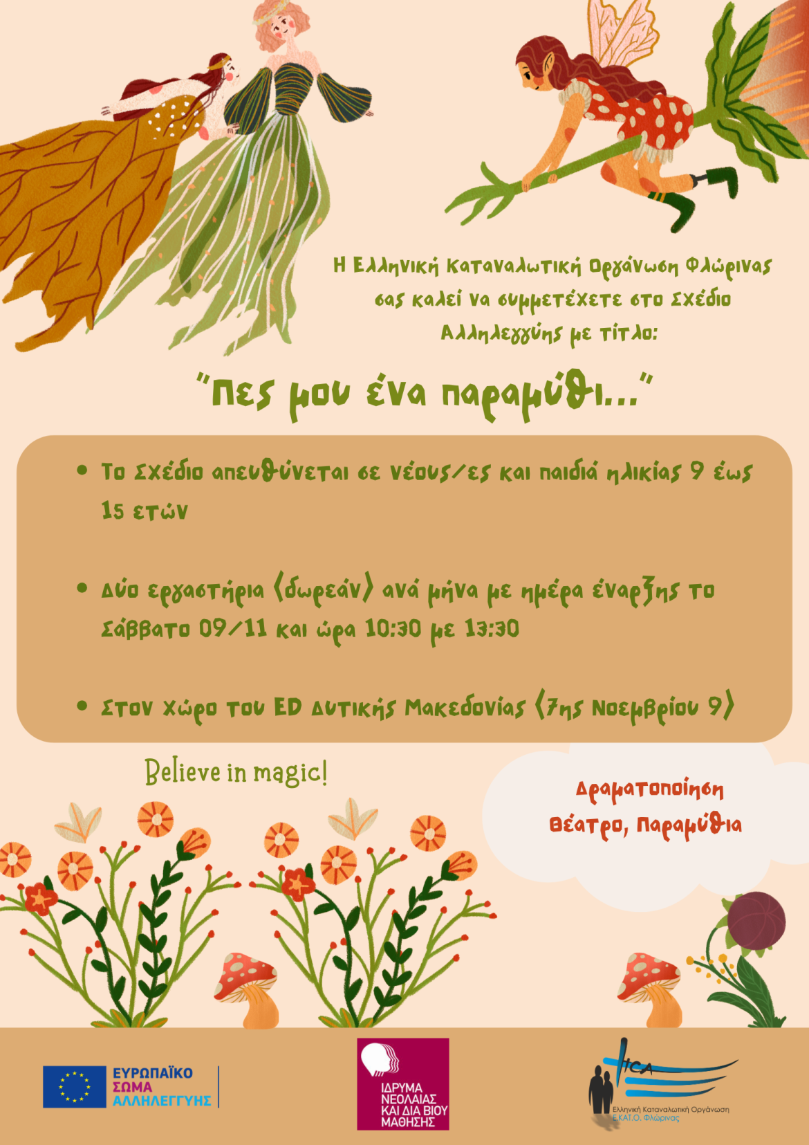 H Ελληνική Καταναλωτική Οργάνωση (Ε.ΚΑΤ.Ο) Φλώρινας σας καλεί να γνωρίσετε και να συμμετέχετε στο Σχέδιο Αλληλεγγύης με τίτλο “Πες μου ένα παραμύθι…”, το οποίο έχει ως στόχο να προσφέρει στους συμμετέχοντες/ουσες του Σχεδίου πολλαπλά οφέλη, με θετική επίδραση στη σωματική και ψυχική υγεία των νέων, αξιοποιώντας τη συγγραφή παραμυθιού και την τεχνική της δραματοποίησης.