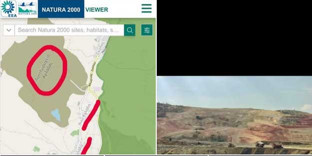 Στην πρώτη φωτογραφία με τον πράσινο χρωματισμό βλέπουμε την περιοχή που είναι θεσμικά ενταγμένη στο δίκτυο Natura 2000, δηλαδή σε καθεστώς προστασίας βάσει της ευρωπαϊκής και εθνικής νομοθεσίας.