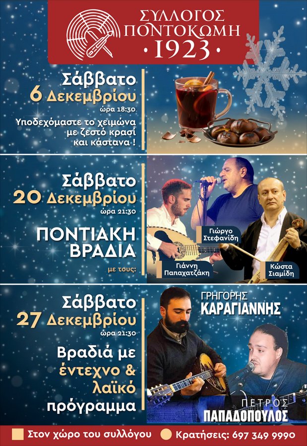 Σύλλογος «Ποντοκώμη 1923» – Τρείς ημέρες γεμάτες καλή διάθεση, χορό, μουσική και τραγούδια / 6 – 20 – 27 Δεκεμβρίου στο χώρο του συλλόγου !