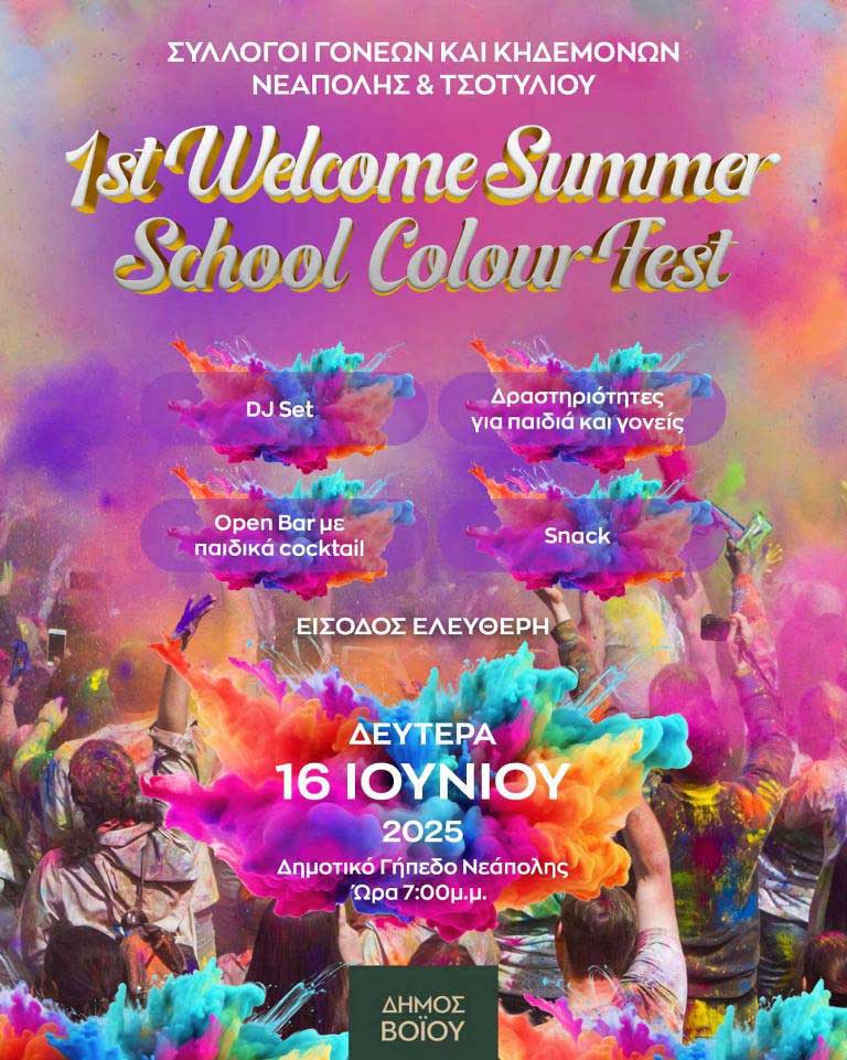 Το 1ο Welcome summer school colour fest διοργανώνουν στη Νεάπολη τη Δευτέρα 16 Ιουνίου οι Σύλλογοι Γονέων και Κηδεμόνων των Δημοτικών Σχολείων Τσοτυλίου και Νεάπολης σε συνεργασία με το Δήμο Βοΐου.