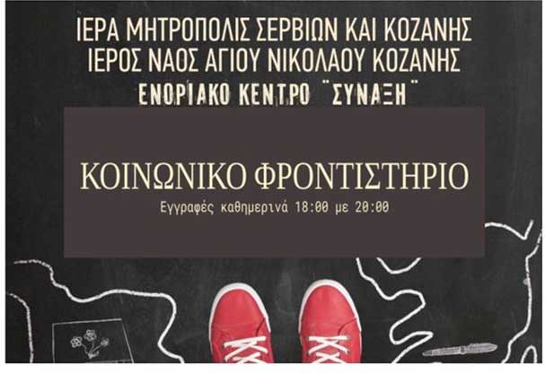 Το Κοινωνικό Φροντιστήριο της Ιεράς Μητροπόλεως Σερβίων και Κοζάνης θα λειτουργήσει και φέτος στο Μπλιούρειο Εκκλησιαστικό Ίδρυμα (στον 1ο όροφο απέναντι από τον Άγιο Νικόλαο). Οι εγγραφές ξεκινούν από τη Δευτέρα 18 Αυγούστου, 6-8 το απόγευμα. Θα δοθεί προτεραιότητα στις εγγραφές των μαθητών της Γ’ Λυκείου μιας και πρόκειται να δημιουργηθούν κλειστά ολιγομελή τμήματα, τα μαθήματα των οποίων θα ξεκινήσουν τη Δευτέρα 1 Σεπτεμβρίου.