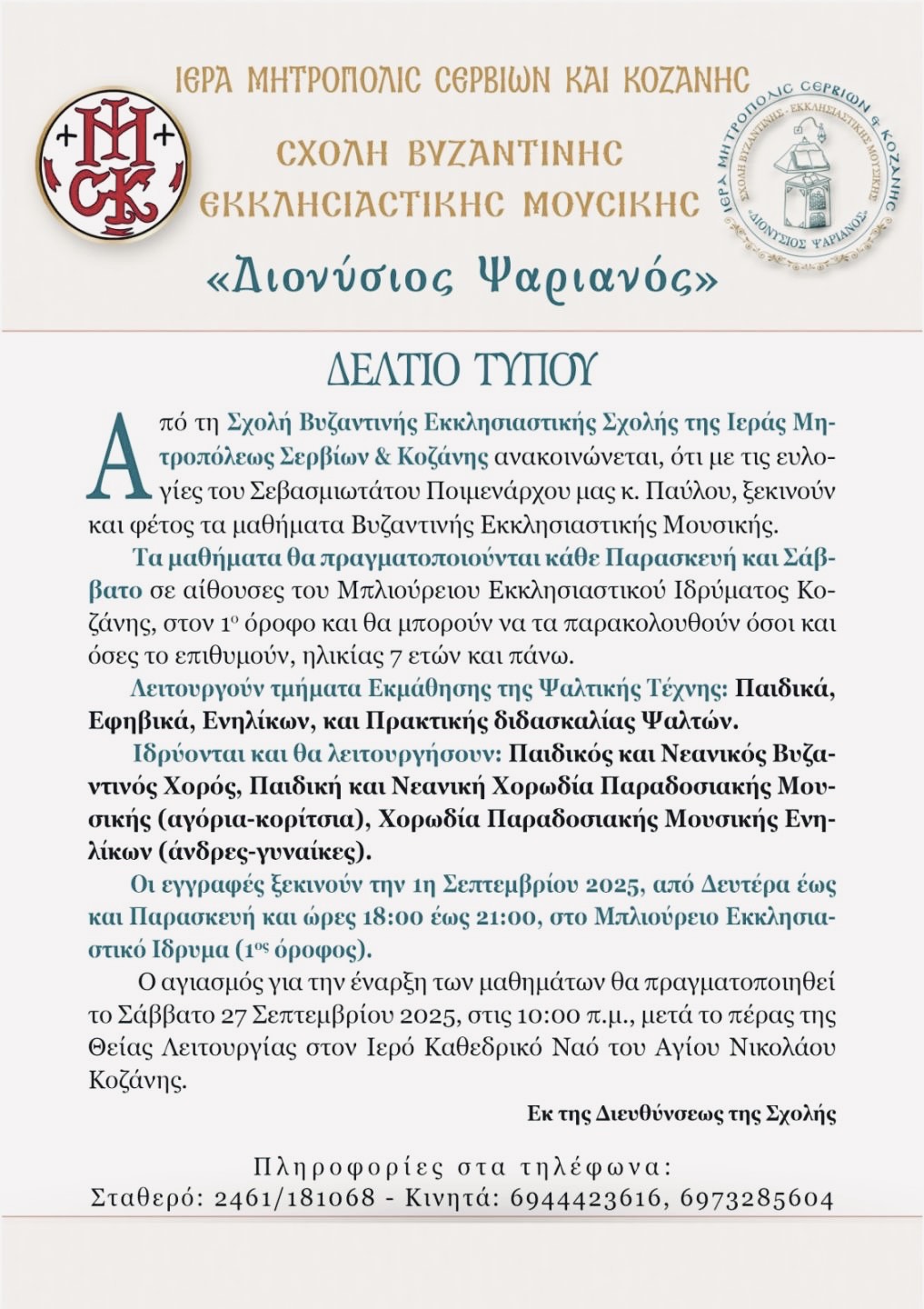 Ξεκινούν τα μαθήματα Βυζαντινής Εκκλησιαστικής Μουσικής της Ι.Μ.Σερβίων και Κοζάνης