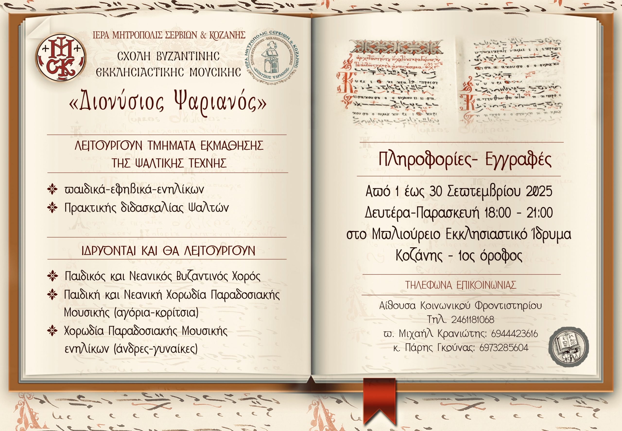 Ξεκινούν τα μαθήματα Βυζαντινής Εκκλησιαστικής Μουσικής της Ι.Μ.Σερβίων και Κοζάνης