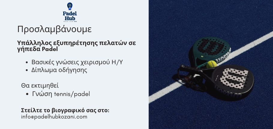 Βιογραφικά μπορούν να σταλούν στο Info@padelhubkozani.com