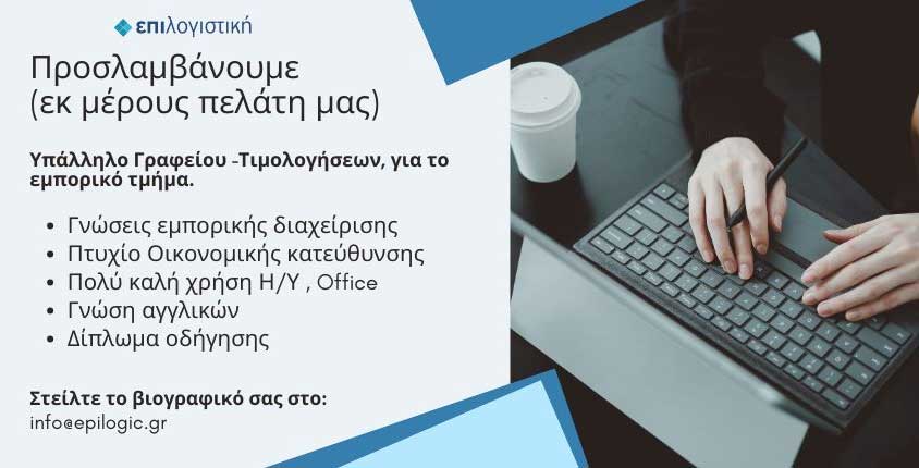 Η εταιρεία ΕΠΙ ΛΟΓΙΣΤΙΚΗ ΙΚΕ η οποία δραστηριοποιείται στον κλάδο της Τήρησης Λογιστικών Βιβλίων και Συμβουλευτική εταιρειών. Εκ μέρους πελάτη μας , αναζητεί άτομο για τη θέση Υπαλλήλου Γραφείου -Τιμολογήσεων, για το εμπορικό τμήμα.